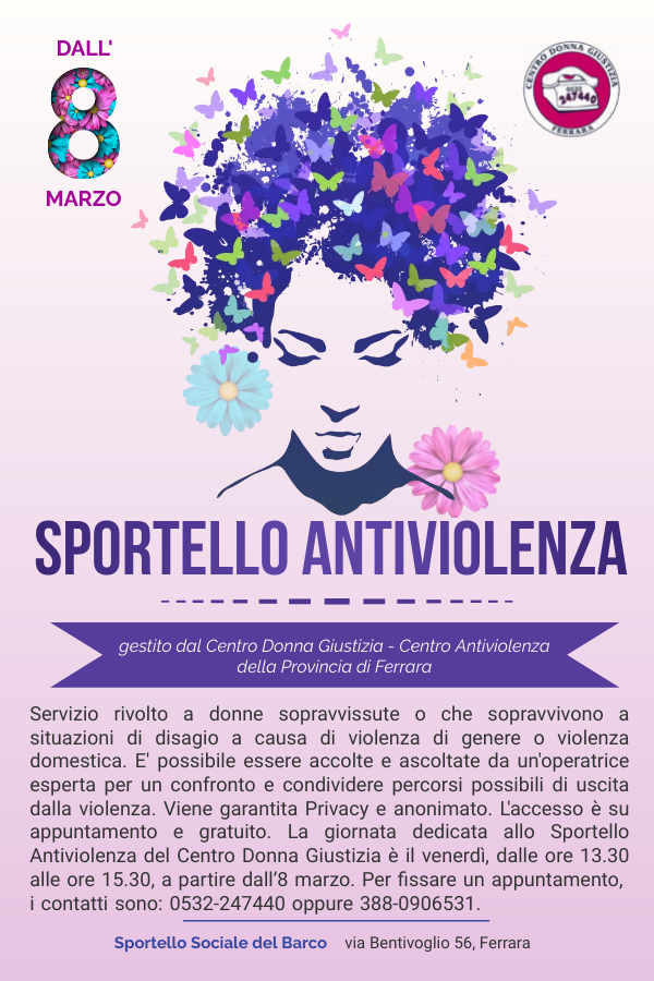 Lo Sportello antiviolenza, gestito dal Centro Donna Giustizia - Centro Antiviolenza della Provincia di Ferrara, è rivolto a donne sopravvissute o che sopravvivono a situazioni di disagio a causa di violenza di genere o violenza domestica.